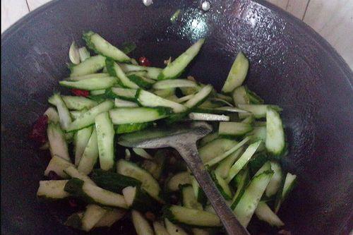 将虎耳瓜切片,肉片切丝,先炒肉片至变色,再加入虎耳瓜片,快速翻炒,最后加入适量的生抽、盐和鸡精调味即可。